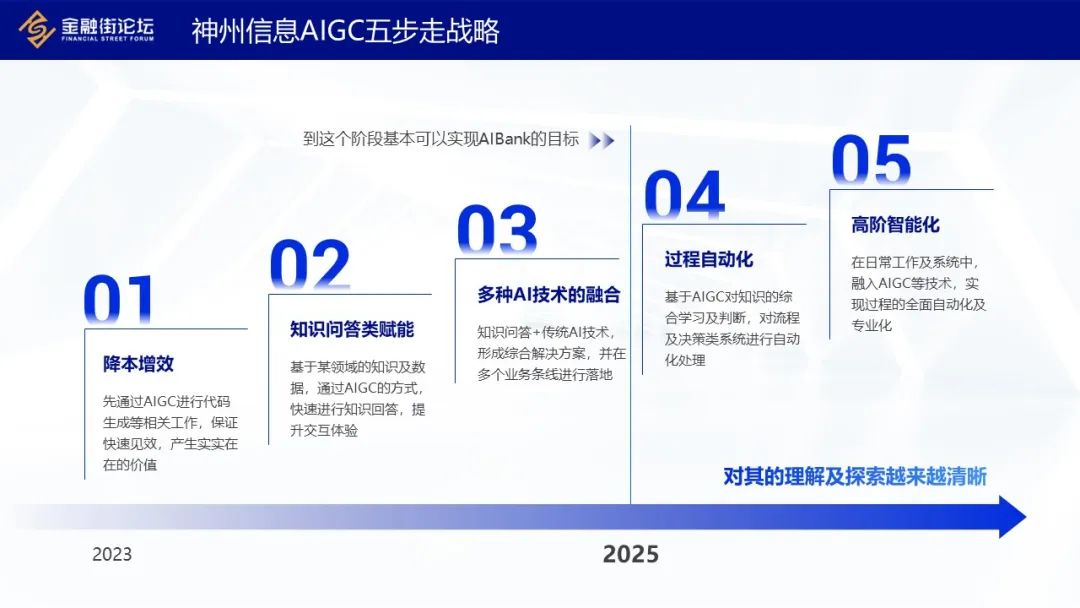 薛春雨介绍了神州信息AIGC五步走战略,通过AIGC降本增效、知识问答类赋能和多种AI技术在业务场景中的融合,基本实现AIBank的战略目标;后续将持续往过程的自动化和高阶智能化发展,以推动金融行业的全面智能化。