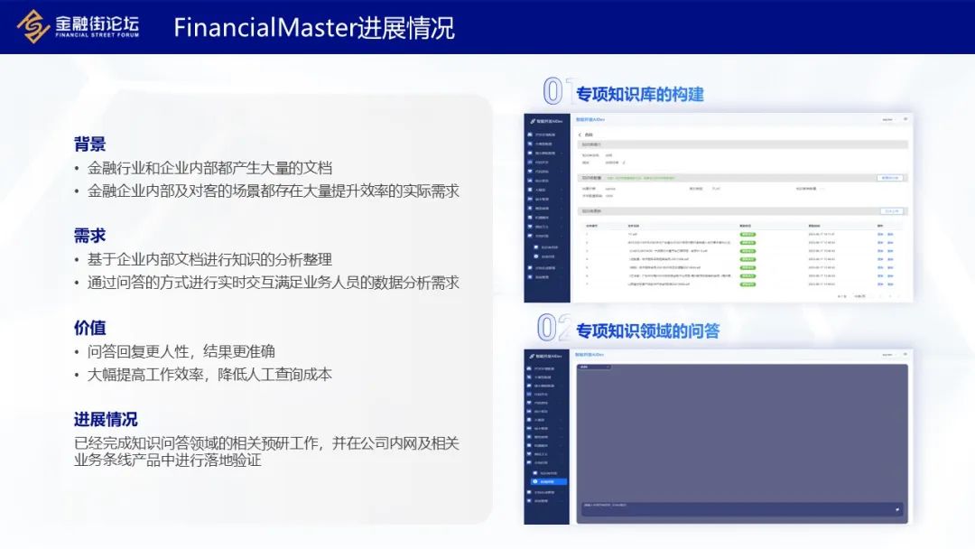 FinancialMaster综合了金融场景模型、Prompt构建、大模型微调、大模型持续训练等适配技术,实现金融专有知识的业务应用,并结合金融机构内部的相关信息,以及提供的各类业务系统的功能,改善用户体验,提供高效的资料查询与信息提炼能力。